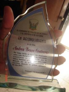 Andrea Bravo miembro de la Asociación Silueta X y Directora del Observatorio Anti-acoso Callejero, recibió un reconocimiento por parte de la Policía Nacional a través del Programa Vigilante seguro del circuito Victoria, en honor a su labor barrial y comunitaria.