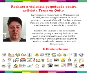 La Federación Ecuatoriana de Organizaciones LGBTI, rechaza categóricamente la brutal golpiza en contra de Gabrielle Esteban activista trans del Colectivo Somos Diversos de Quito, en un evidente caso de xenofobia y transfobia.