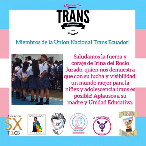 Saludamos la fuerza y coraje de Irina del Rocio Jurado, quien nos demuestra que con su lucha y visibilidad, un mundo mejor para la niñez y adolescencia trans es posible! Aplausos a su madre y Unidad Educativa.