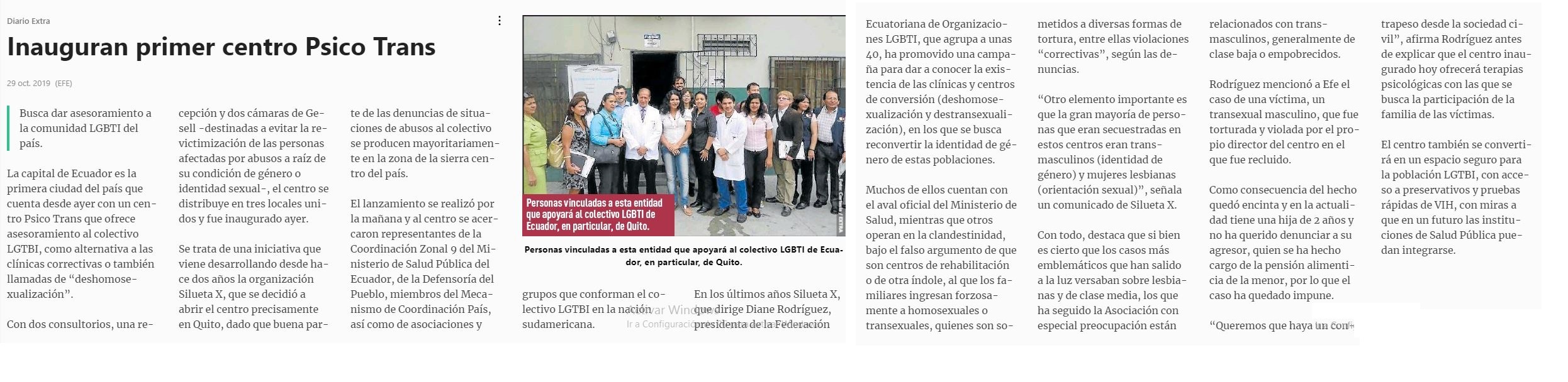 Reportaje de diario El Extra – Inauguran primer Centro psico Trans en Ecuador – Asociación Silueta X