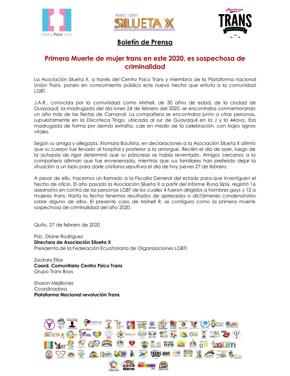 Primera-Muerte-de-mujer-trans-en-este-2020_-es-sospechosa-de-criminalidad-Asociación-Silueta-X Publicado 27 febrero, 2020 en 1700 × 2200 en Primera muerte del 2020 contra mujer trans sospechosa de criminalidad ← Anterior