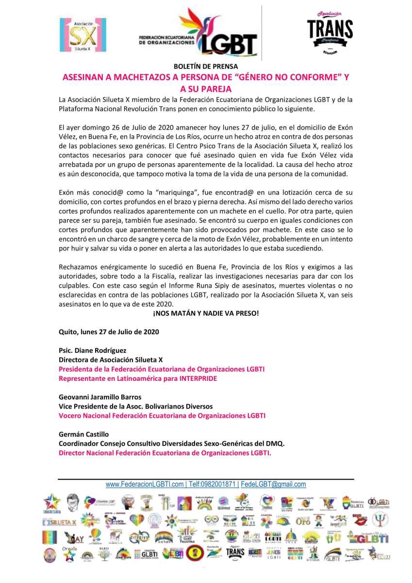 Boletín de Prensa – ASESINAN A MACHETAZOS A PERSONA DE “GÉNERO NO CONFORME” Y A SU PAREJA – Asociación Silueta X – Federación ecuatoriana de Organi