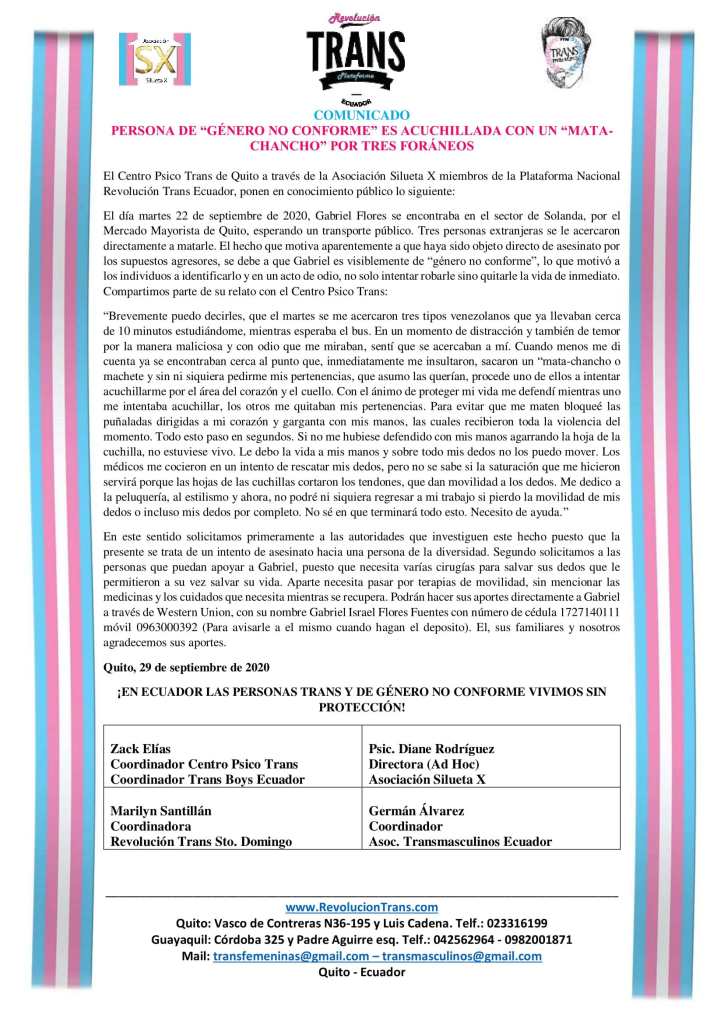 El día martes 22 de septiembre de 2020, Gabriel Flores se encontraba en el sector de Solanda, por el Mercado Mayorista de Quito, esperando un transporte público. Tres personas extranjeras se le acercaron directamente a matarle. El hecho que motiva aparentemente a que haya sido objeto directo de asesinato por los supuestos agresores, se debe a que Gabriel es visiblemente de “género no conforme”, lo que motivó a los individuos a identificarlo y en un acto de odio, no solo intentar robarle sino quitarle la vida de inmediato. Compartimos parte de su relato con el Centro Psico Trans: