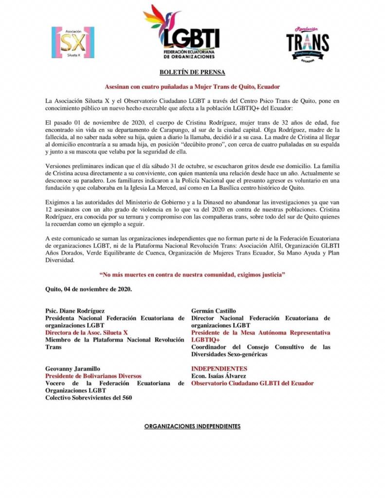 El pasado 01 de noviembre de 2020, el cuerpo de Cristina Rodríguez, mujer trans de 32 años de edad, fue encontrado sin vida en su departamento de Carapungo, al sur de la ciudad capital. Olga Rodríguez, madre de la fallecida, al no saber nada sobre su hija, quien a diario la llamaba, decidió ir a su casa. La madre de Cristina al llegar al domicilio encontraría a su amada hija, en posición “decúbito prono”, con cerca de cuatro puñaladas en su espalda y junto a su mascota que velaba por la seguridad de ella.