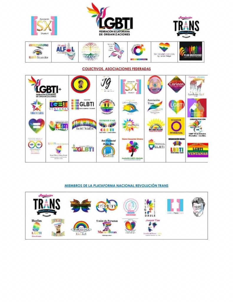 A este comunicado se suman las organizaciones independientes que no forman parte ni de la Federación Ecuatoriana de organizaciones LGBT, ni de la Plataforma Nacional Revolución Trans: Asociación Alfil, Organización GLBTI Años Dorados, Verde Equilibrante de Cuenca, Organización de Mujeres Trans Ecuador, Su Mano Ayuda y Plan Diversidad.