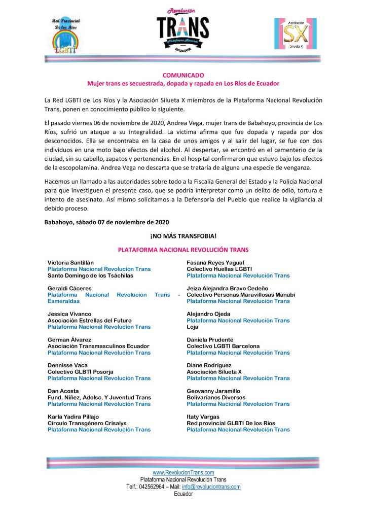 El pasado viernes 06 de noviembre de 2020, Andrea Vega, mujer trans de Babahoyo, provincia de Los Ríos, sufrió un ataque a su integralidad. La victima afirma que fue dopada y rapada por dos desconocidos. Ella se encontraba en la casa de unos amigos y al salir del lugar, se fue con dos individuos en una moto bajo efectos del alcohol. Al despertar, se encontró en el cementerio de la ciudad, sin su cabello, zapatos y pertenencias. En el hospital confirmaron que estuvo bajo los efectos de la escopolamina. Andrea Vega no descarta que se trataría de alguna una especie de venganza.