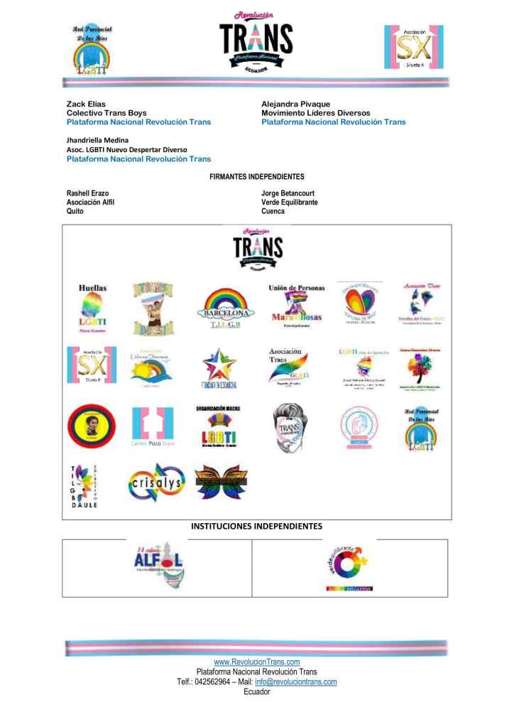 | Victoria Santillán Plataforma Nacional Revolución Trans Santo Domingo de los Tsáchilas | Fasana Reyes Yagual Colectivo Huellas LGBTI Plataforma Nacional Revolución Trans |