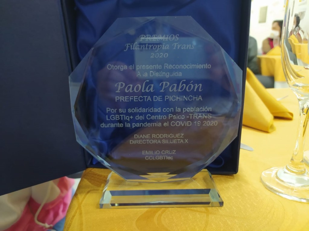 La Prefectura de Pichincha a falta de la solidaridad del Gobierno Nacional que ignoró en varias ciudades a los LGBT, envió canastas de alimentos al CPT de Silueta X y la CCLGBTIec, para que pudieran ser distribuidos en la población sexo genérica, que había caído en estado de precariedad. Ninguna autoridad en el territorio pichinchano hizo este enlace con el Centro Psico Trans y la CCLGBTec; por ello la Prefecta recibió el reconocimiento “Filantropía LGBTI”, por su respuesta adecuada durante la pandemia del COVID19 con las poblaciones LGBTIQ+.