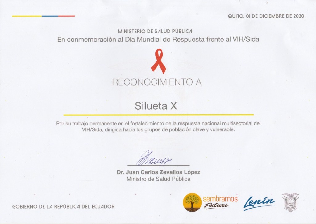 Silueta X luego de 10 años trabajo en VIH recibe un reconocimiento por parte del Ministerio de Salud Publica del Ecuador, el cual indica: