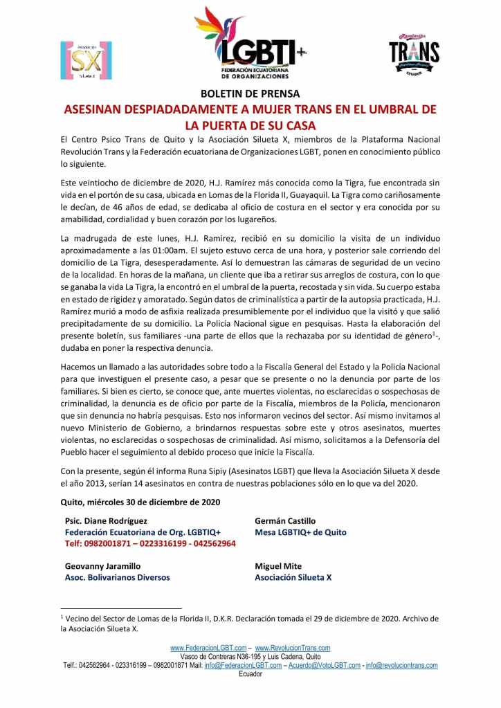 El Centro Psico Trans de Quito y la Asociación Silueta X, miembros de la Plataforma Nacional Revolución Trans y la Federación ecuatoriana de Organizaciones LGBT, ponen en conocimiento público lo siguiente.