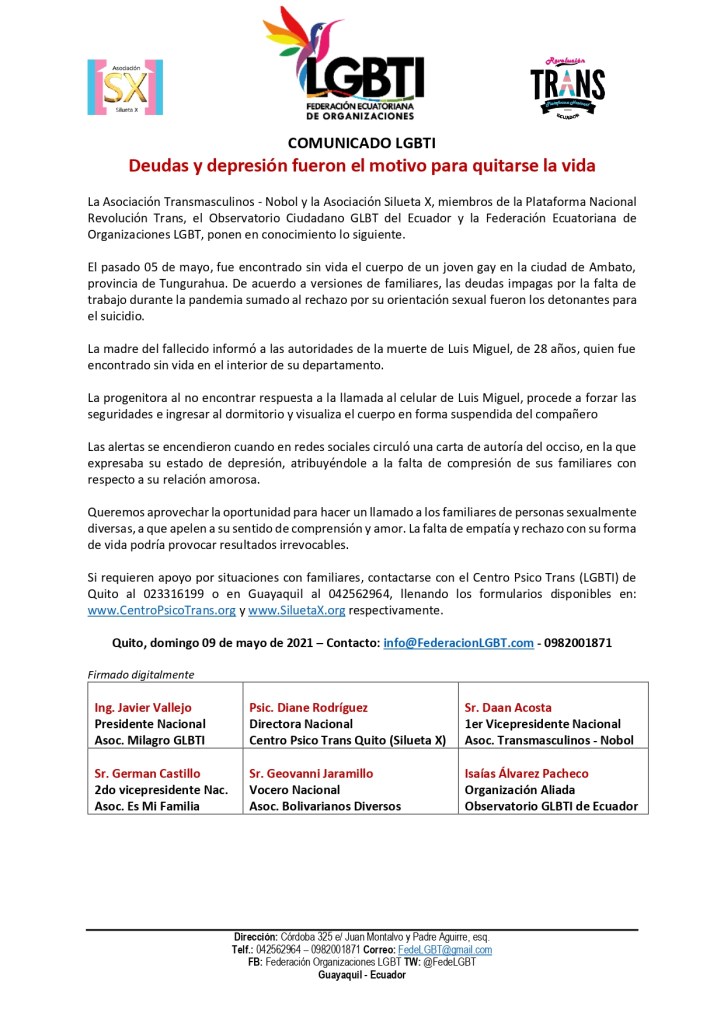 El pasado 05 de mayo, fue encontrado sin vida el cuerpo de un joven gay en la ciudad de Ambato, provincia de Tungurahua. De acuerdo a versiones de familiares, las deudas impagas por la falta de trabajo durante la pandemia sumado al rechazo por su orientación sexual fueron los detonantes para el suicidio.