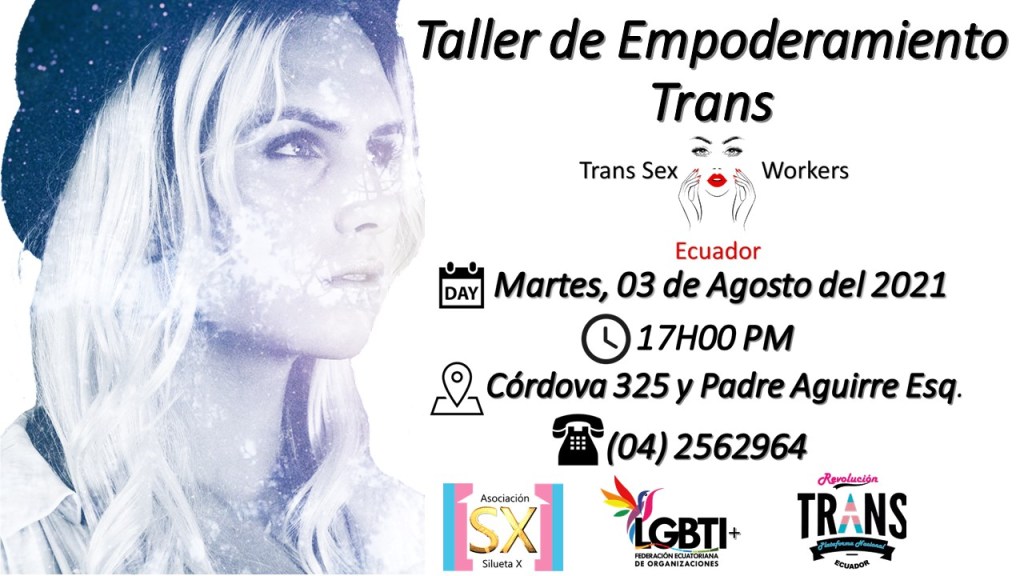 Taller de Empoderamiento Trans 30 julio, 2021 · de Anunciante · en Acciones, Actividades. · Dia: Martes, 03 de Agosto del 2021 Hora: 17h00 pm Dirección: Córdova 325 Padre Aguirre Esq. Teléfono: (04) 2562964 Comparte: Compartir en X (Se abre en una ventana nueva) X Comparte en Facebook (Se abre en una ventana nueva) Facebook Compartir en WhatsApp (Se abre en una ventana nueva) WhatsApp Compartir en Telegram (Se abre en una ventana nueva) Telegram