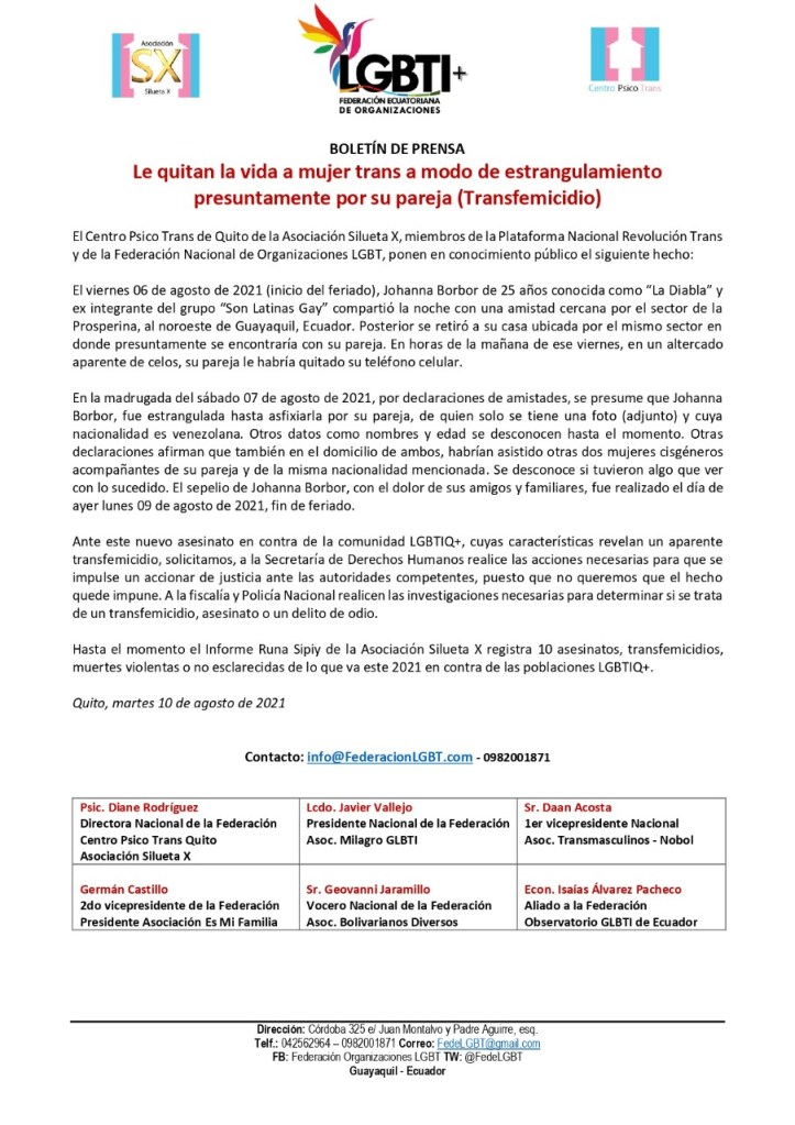 El Centro Psico Trans de Quito de la Asociación Silueta X, miembros de la Plataforma Nacional Revolución Trans y de la Federación Nacional de Organizaciones LGBT, ponen en conocimiento público el siguiente hecho: