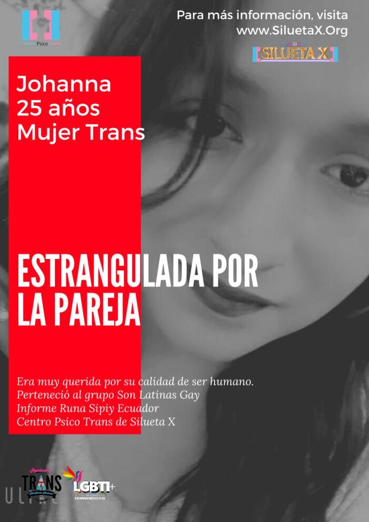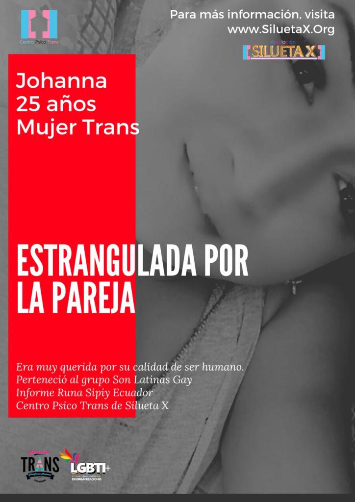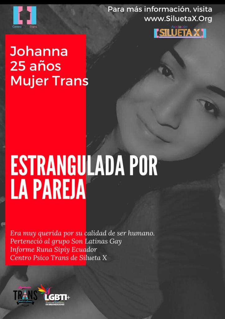 En la madrugada del sábado 07 de agosto de 2021, por declaraciones de amistades, se presume que Johanna Borbor, fue estrangulada hasta asfixiarla por su pareja, de quien solo se tiene una foto (adjunto) y cuya nacionalidad es venezolana. Otros datos como nombres y edad se desconocen hasta el momento. Otras declaraciones afirman que también en el domicilio de ambos, habrían asistido otras dos mujeres cisgéneros acompañantes de su pareja y de la misma nacionalidad mencionada. Se desconoce si tuvieron algo que ver con lo sucedido. El sepelio de Johanna Borbor, con el dolor de sus amigos y familiares, fue realizado el día de ayer lunes 09 de agosto de 2021, fin de feriado.