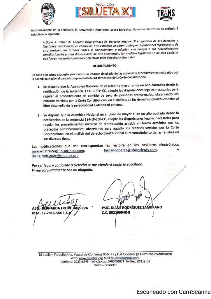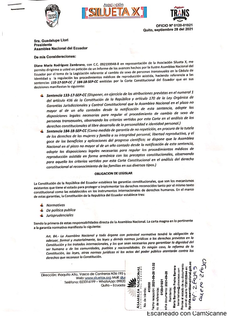 Carta a la Asamblea Nacional del Ecuador sobre el incumplimiento a dictámenes de la Corte en relación al cambio de sexo en trans de Ecuador