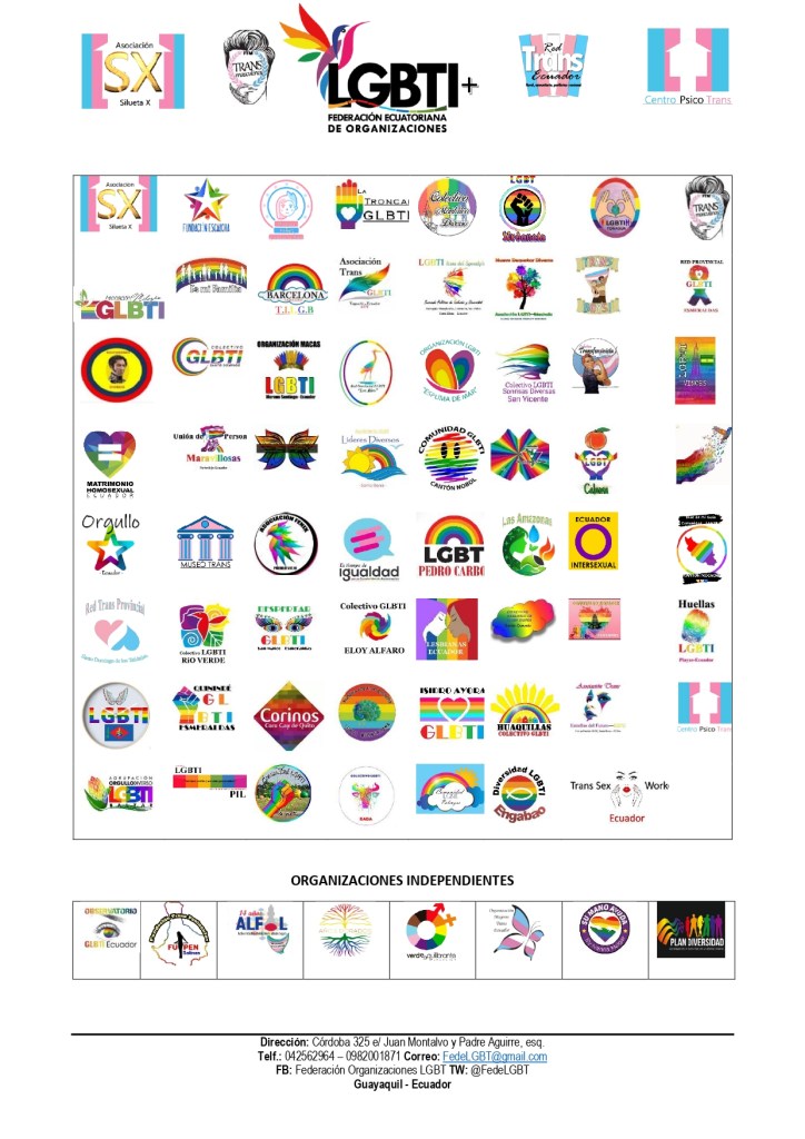 | Psic. Diane Rodríguez Directora Nacional de la Federación Centro Psico Trans Quito Asociación Silueta X | Lcdo. Javier Vallejo Presidente Nacional de la Federación Asoc. Milagro GLBTI | Sr. Daan Acosta 1er vicepresidente Nacional Asoc. Transmasculinos – Nobol |