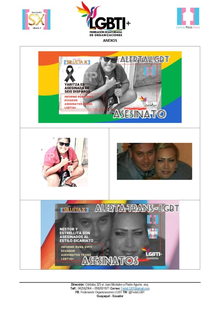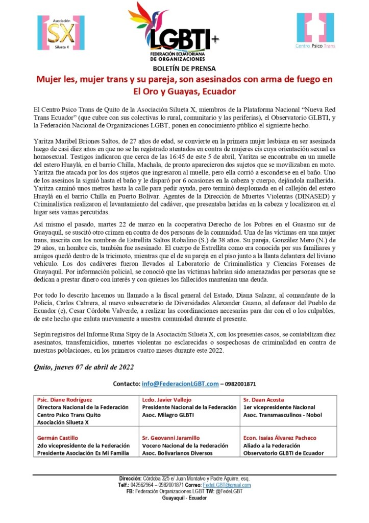 El Centro Psico Trans de Quito de la Asociación Silueta X, miembros de la Plataforma Nacional “Nueva Red Trans Ecuador” (que cubre con sus colectivas lo rural, comunitario y las periferias), el Observatorio GLBTI, y la Federación Nacional de Organizaciones LGBT, ponen en conocimiento público el siguiente hecho.