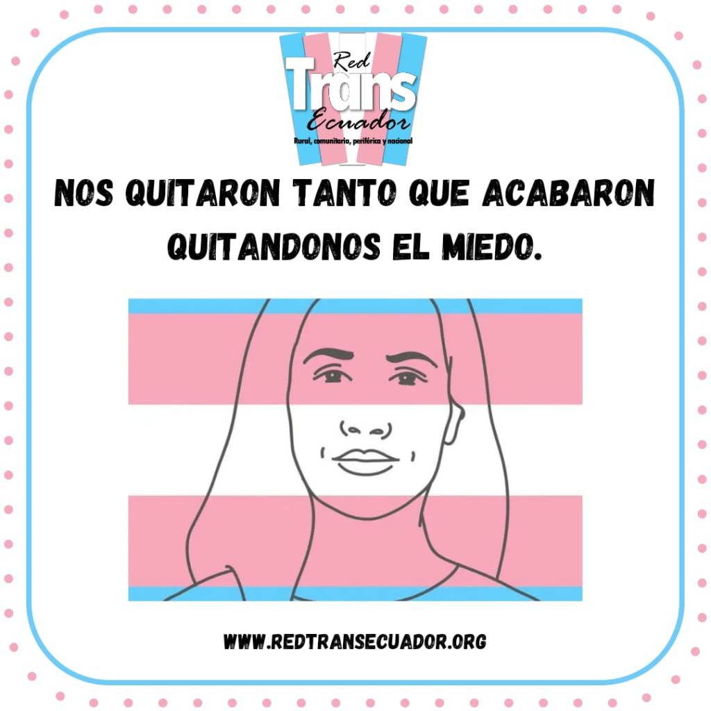 Nos quitaron tanto que acabaron quitandonos el miedo. 14 abril, 2022 · de Anunciante · en Acciones, Actividades. · #NuevaRedTransEcuador #PlataformaNacionalTrans #RedTransEcuador #RevolucionTrans Www.redtransecuador.org Comparte: Compartir en X (Se abre en una ventana nueva) X Comparte en Facebook (Se abre en una ventana nueva) Facebook Compartir en WhatsApp (Se abre en una ventana nueva) WhatsApp Compartir en Telegram (Se abre en una ventana nueva) Telegram