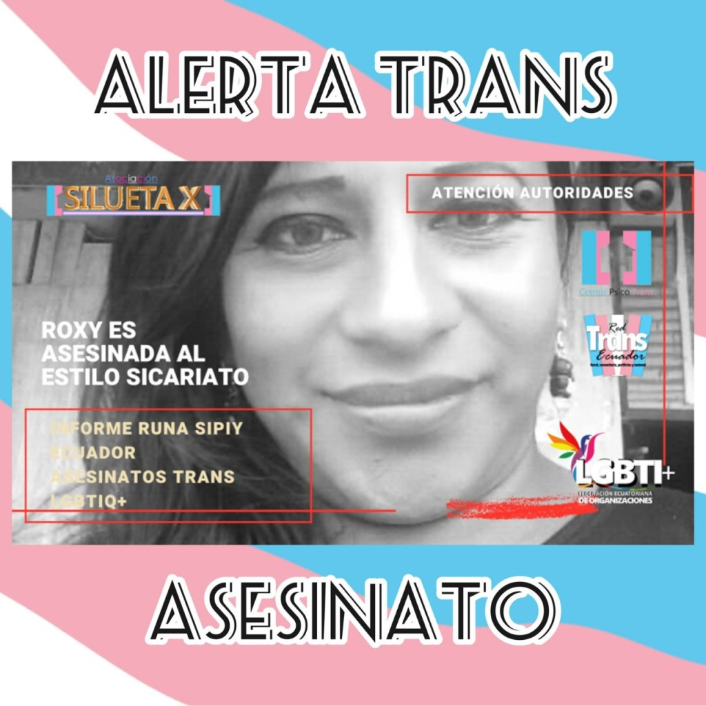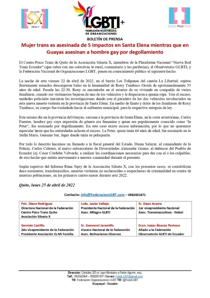 El Centro Psico Trans de Quito de la Asociación Silueta X, miembros de la Plataforma Nacional “Nueva Red Trans Ecuador” (que cubre con sus colectivas lo rural, comunitario y las periferias), el Observatorio GLBTI, y la Federación Nacional de Organizaciones LGBT, ponen en conocimiento público el siguiente hecho.
