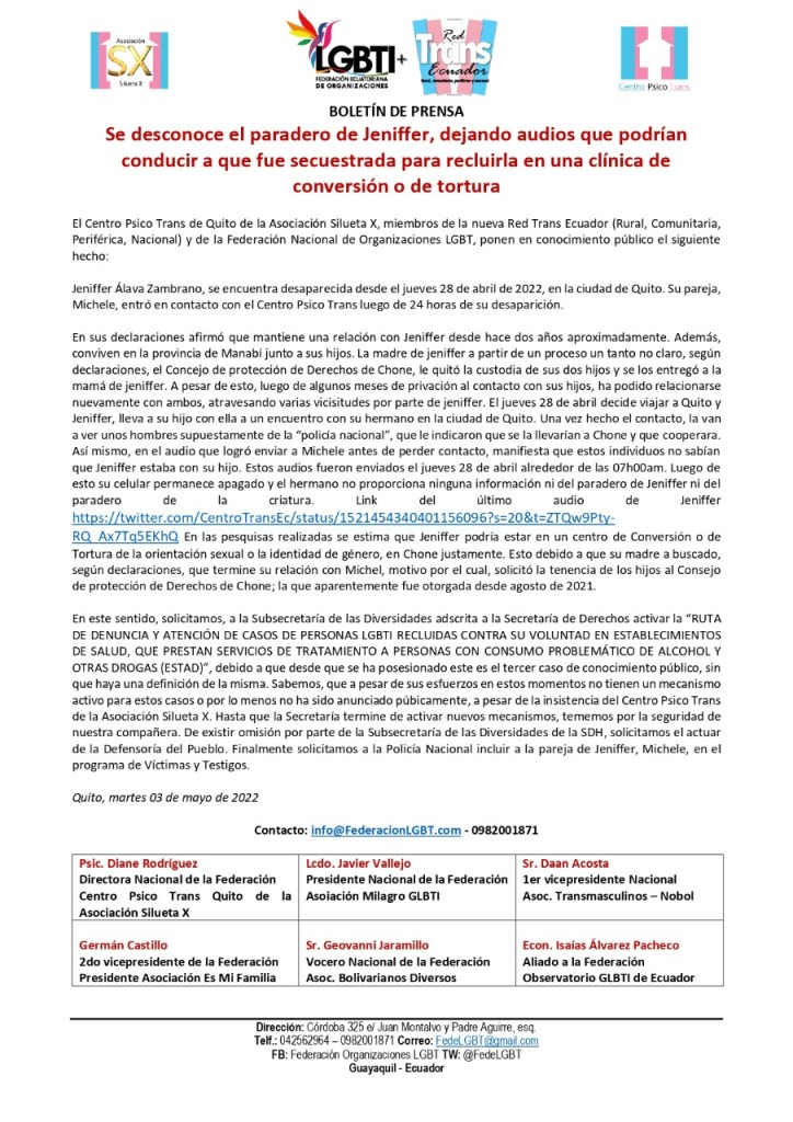 En sus declaraciones afirmó que mantiene una relación con Jeniffer desde hace dos años aproximadamente. Además, conviven en la provincia de Manabí junto a sus hijos. La madre de jeniffer a partir de un proceso un tanto no claro, según declaraciones, el Concejo de protección de Derechos de Chone, le quitó la custodia de sus dos hijos y se los entregó a la mamá de jeniffer. A pesar de esto, luego de algunos meses de privación al contacto con sus hijos, ha podido relacionarse nuevamente con ambos, atravesando varias vicisitudes por parte de jeniffer. El jueves 28 de abril decide viajar a Quito y Jeniffer, lleva a su hijo con ella a un encuentro con su hermano en la ciudad de Quito. Una vez hecho el contacto, la van a ver unos hombres supuestamente de la “policía nacional”, que le indicaron que se la llevarían a Chone y que cooperara. Así mismo, en el audio que logró enviar a Michele antes de perder contacto, manifiesta que estos individuos no sabían que Jeniffer estaba con su hijo. Estos audios fueron enviados el jueves 28 de abril alrededor de las 07h00am. Luego de esto su celular permanece apagado y el hermano no proporciona ninguna información ni del paradero de Jeniffer ni del paradero de la criatura. Link del último audio de Jeniffer https://twitter.com/CentroTransEc/status/1521454340401156096?s=20&t=ZTQw9Pty-RQ_Ax7Tq5EKhQ En las pesquisas realizadas se estima que Jeniffer podría estar en un centro de Conversión o de Tortura de la orientación sexual o la identidad de género, en Chone justamente. Esto debido a que su madre a buscado, según declaraciones, que termine su relación con Michel, motivo por el cual, solicitó la tenencia de los hijos al Consejo de protección de Derechos de Chone; la que aparentemente fue otorgada desde agosto de 2021.