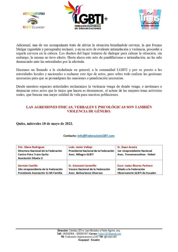 Los/las/les miembros de la Plataforma Nacional Revolución Trans “Nueva Red Trans Ecuador” (que cubre con sus colectivas lo rural, comunitario y las periferias), el Observatorio GLBTI, y la Federación Nacional de Organizaciones LGBT, ponen en conocimiento público el siguiente hecho.