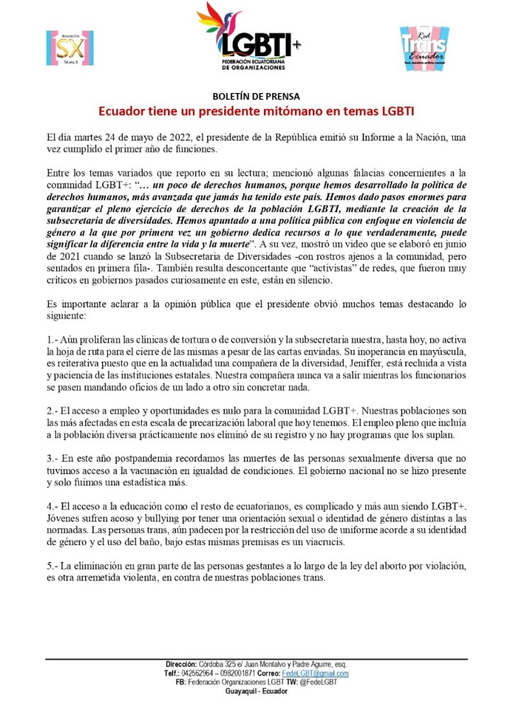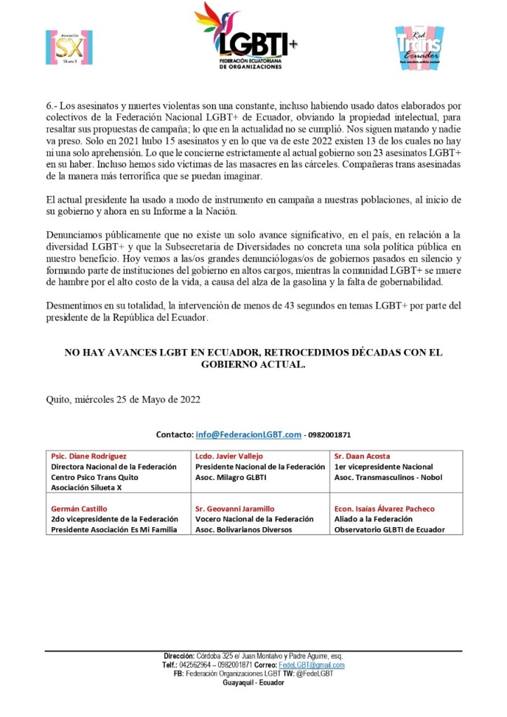 6.- Los asesinatos y muertes violentas son una constante, incluso habiendo usado datos elaborados por colectivos de la Federación Nacional LGBT+ de Ecuador, obviando la propiedad intelectual, para resaltar sus propuestas de campaña; lo que en la actualidad no se cumplió. Nos siguen matando y nadie va preso. Solo en 2021 hubo 15 asesinatos y en lo que va de este 2022 existen 13 de los cuales no hay ni una solo aprehensión. Lo que le concierne estrictamente al actual gobierno son 23 asesinatos LGBT+ en su haber. Incluso hemos sido víctimas de las masacres en las cárceles. Compañeras trans asesinadas de la manera más terrorífica que se puedan imaginar.