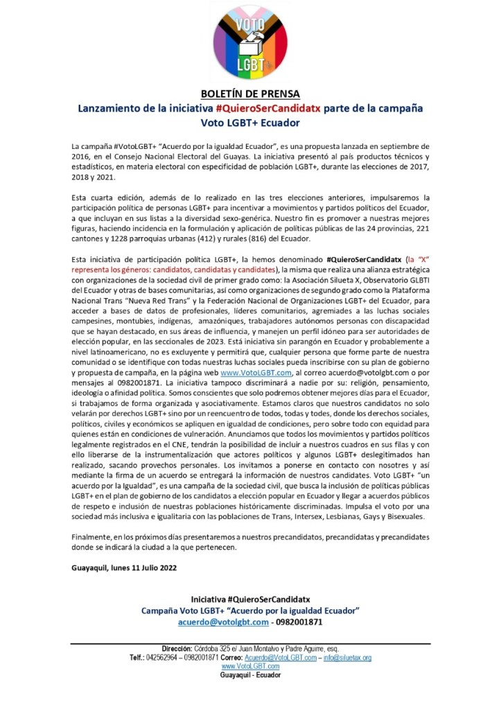 Esta iniciativa de participación política LGBT+, la hemos denominado #QuieroSerCandidatx (la “X” representa los géneros: candidatos, candidatas y candidates), la misma que realiza una alianza estratégica con organizaciones de la sociedad civil de primer grado como: la Asociación Silueta X, Observatorio GLBTI del Ecuador y otras de bases comunitarias, así como organizaciones de segundo grado como la Plataforma Nacional Trans “Nueva Red Trans” y la Federación Nacional de Organizaciones LGBT+ del Ecuador, para acceder a bases de datos de profesionales, líderes comunitarios, agremiades a las luchas sociales campesines, montubies, indígenas, amazóniques, trabajadores autónomos personas con discapacidad que se hayan destacado, en sus áreas de influencia, y manejen un perfil idóneo para ser autoridades de elección popular, en las seccionales de 2023. Está iniciativa sin parangón en Ecuador y probablemente a nivel latinoamericano, no es excluyente y permitirá que, cualquier persona que forme parte de nuestra comunidad o se identifique con todas nuestras luchas sociales pueda inscribirse con su plan de gobierno y propuesta de campaña, en la página web http://www.VotoLGBT.com, al correo acuerdo@votolgbt.com o por mensajes al 0982001871. La iniciativa tampoco discriminará a nadie por su: religión, pensamiento, ideología o afinidad política. Somos conscientes que solo podremos obtener mejores días para el Ecuador, si trabajamos de forma organizada y asociativamente. Estamos claros que nuestros candidatos no solo velarán por derechos LGBT+ sino por un reencuentro de todos, todas y todes, donde los derechos sociales, políticos, civiles y económicos se apliquen en igualdad de condiciones, pero sobre todo con equidad para quienes están en condiciones de vulneración. Anunciamos que todos los movimientos y partidos políticos legalmente registrados en el CNE, tendrán la posibilidad de incluir a nuestros cuadros en sus filas y con ello liberarse de la instrumentalización que actores políticos y algunos LGBT+ deslegitimados han realizado, sacando provechos personales. Los invitamos a ponerse en contacto con nosotres y así mediante la firma de un acuerdo se entregará la información de nuestros candidates. Voto LGBT+ “un acuerdo por la Igualdad”, es una campaña de la sociedad civil, que busca la inclusión de políticas públicas LGBT+ en el plan de gobierno de los candidatos a elección popular en Ecuador y llegar a acuerdos públicos de respeto e inclusión de nuestras poblaciones históricamente discriminadas. Impulsa el voto por una sociedad más inclusiva e igualitaria con las poblaciones de Trans, Intersex, Lesbianas, Gays y Bisexuales.