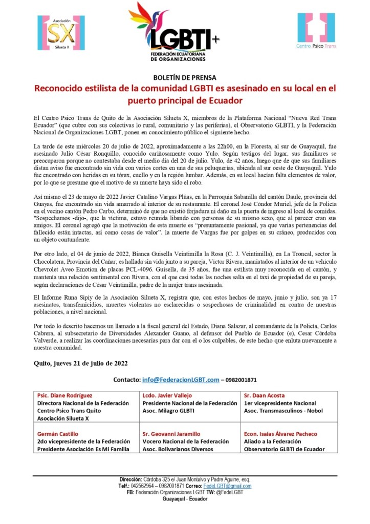 El Centro Psico Trans de Quito de la Asociación Silueta X, miembros de la Plataforma Nacional “Nueva Red Trans Ecuador” (que cubre con sus colectivas lo rural, comunitario y las periferias), el Observatorio GLBTI, y la Federación Nacional de Organizaciones LGBT, ponen en conocimiento público el siguiente hecho.