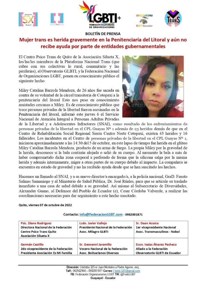 El Centro Psico Trans de Quito de la Asociación Silueta X, los/las/les miembros de la Plataforma Nacional Trans (que cubre con sus colectivas lo rural, comunitario y las periferias), el Observatorio GLBTI, y la Federación Nacional de Organizaciones LGBT, ponen en conocimiento público el siguiente hecho.