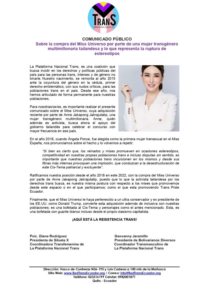 Para nosotras/os/es, es importante realizar el presente comunicado sobre el Miss Universo, cuya adquisición reciente por parte de Anne Jakapong Jakrajutatip, una mujer transgénero multimillonaria. Anne, quién además es activista, busca ahora el apoyo del gobierno tailandés para celebrar el concurso con mayor frecuencia en ese país.