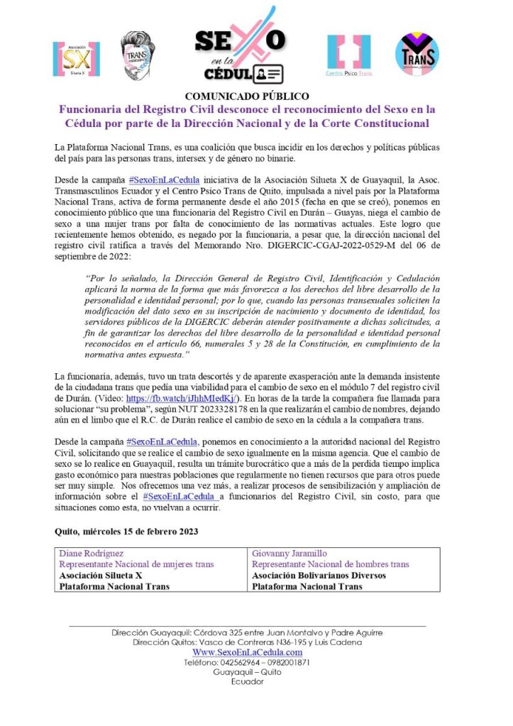 Desde la campaña #SexoEnLaCedula iniciativa de la Asociación Silueta X de Guayaquil, la Asoc. Transmasculinos Ecuador y el Centro Psico Trans de Quito, impulsada a nivel país por la Plataforma Nacional Trans, activa de forma permanente desde el año 2015 (fecha en que se creó), ponemos en conocimiento público que una funcionaria del Registro Civil en Durán – Guayas, niega el cambio de sexo a una mujer trans por falta de conocimiento de las normativas actuales. Este logro que recientemente hemos obtenido, es negado por la funcionaria, a pesar que, la dirección nacional del registro civil ratifica a través del Memorando Nro. DIGERCIC-CGAJ-2022-0529-M del 06 de septiembre de 2022:
