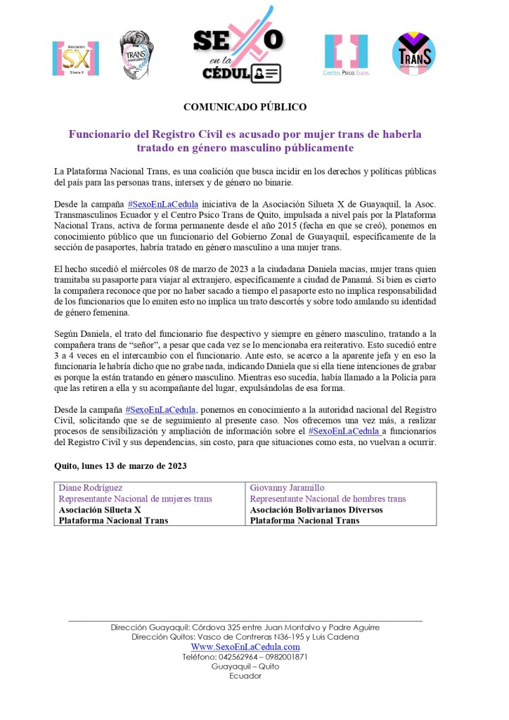 Desde la campaña #SexoEnLaCedula iniciativa de la Asociación Silueta X de Guayaquil, la Asoc. Transmasculinos Ecuador y el Centro Psico Trans de Quito, impulsada a nivel país por la Plataforma Nacional Trans, activa de forma permanente desde el año 2015 (fecha en que se creó), ponemos en conocimiento público que un funcionario del Gobierno Zonal de Guayaquil, específicamente de la sección de pasaportes, habría tratado en género masculino a una mujer trans.