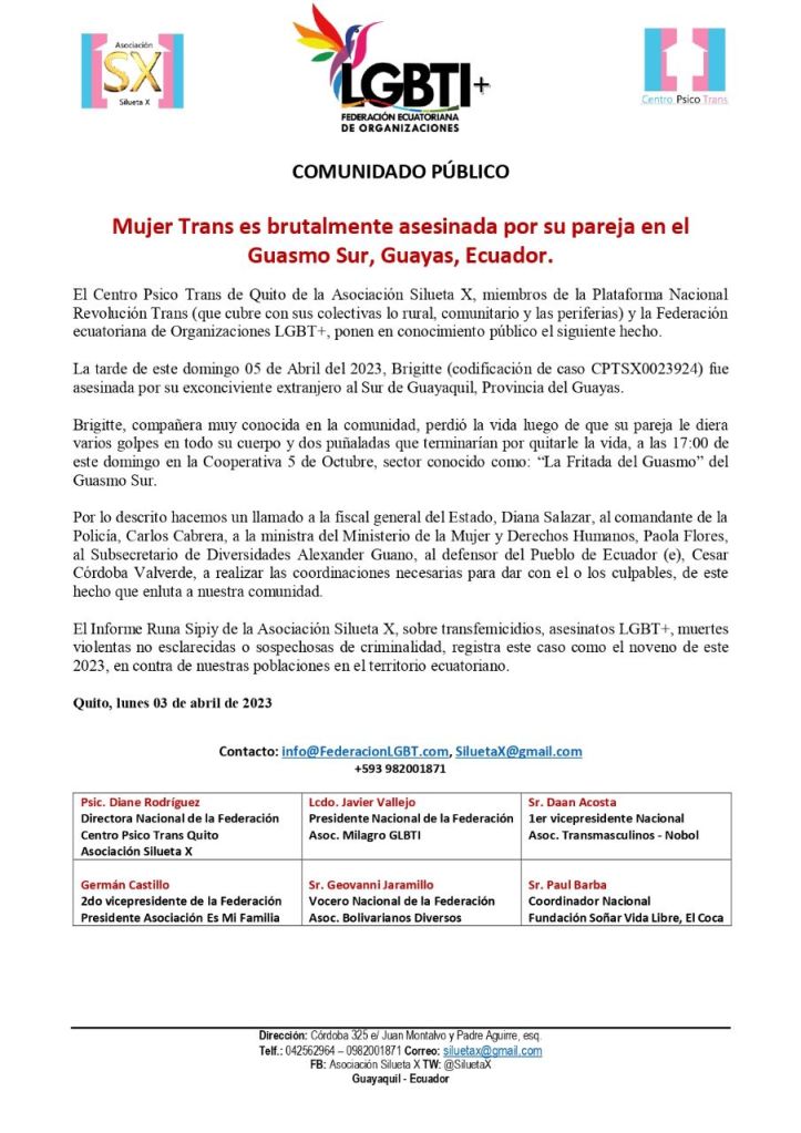 El Centro Psico Trans de Quito de la Asociación Silueta X, miembros de la Plataforma Nacional Revolución Trans (que cubre con sus colectivas lo rural, comunitario y las periferias) y la Federación ecuatoriana de Organizaciones LGBT+, ponen en conocimiento público el siguiente hecho.