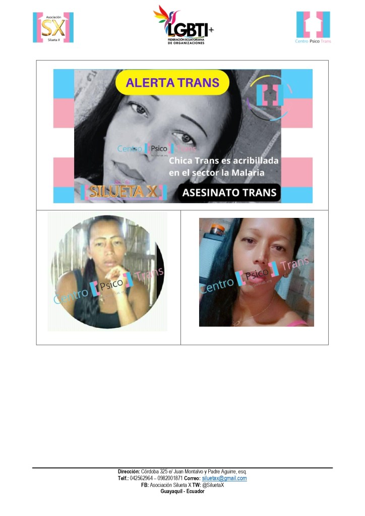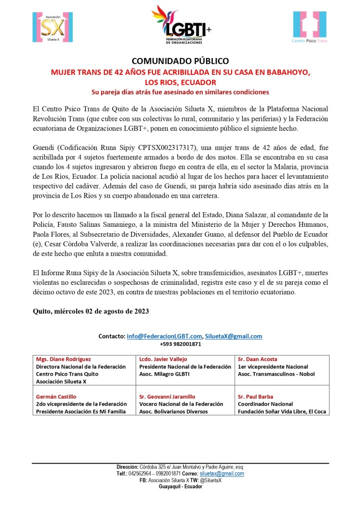 El Centro Psico Trans de Quito de la Asociación Silueta X, miembros de la Plataforma Nacional Revolución Trans (que cubre con sus colectivas lo rural, comunitario y las periferias) y la Federación ecuatoriana de Organizaciones LGBT+, ponen en conocimiento público el siguiente hecho.