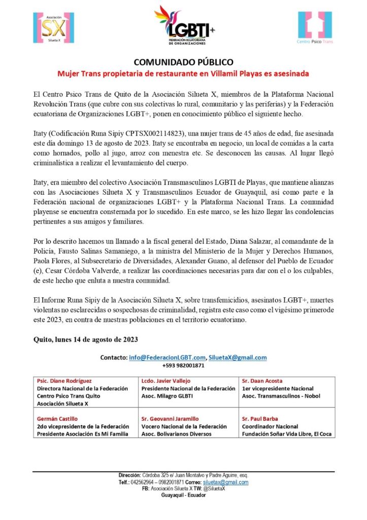 El Centro Psico Trans de Quito de la Asociación Silueta X, miembros de la Plataforma Nacional Revolución Trans (que cubre con sus colectivas lo rural, comunitario y las periferias) y la Federación ecuatoriana de Organizaciones LGBT+, ponen en conocimiento público el siguiente hecho.