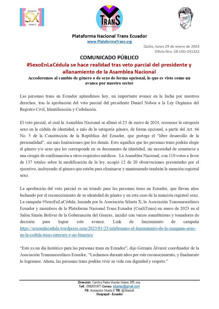 La aprobación del veto parcial es un triunfo para las personas trans en Ecuador, que llevan años luchando por el reconocimiento de su identidad de género y en este caso de la mención registral sexo. La campaña #SexoEnLaCédula, lanzada por la Asociación Silueta X, la Asociación Transmasculinos Ecuador y miembros de la Plataforma Nacional Trans Ecuador (CoaliTrans) en enero de 2023 en el Salón Simón Bolívar de la Gobernación del Guayas, incidió con varios asambleístas y tomadores de decisión para lograr este avance. Link de lanzamiento de campaña https://sexoenlacedula.wordpress.com/2023/01/23/celebramos-el-lanzamiento-de-la-campana-sexo-en-la-cedula-trans-intersex-y-no-binaries/