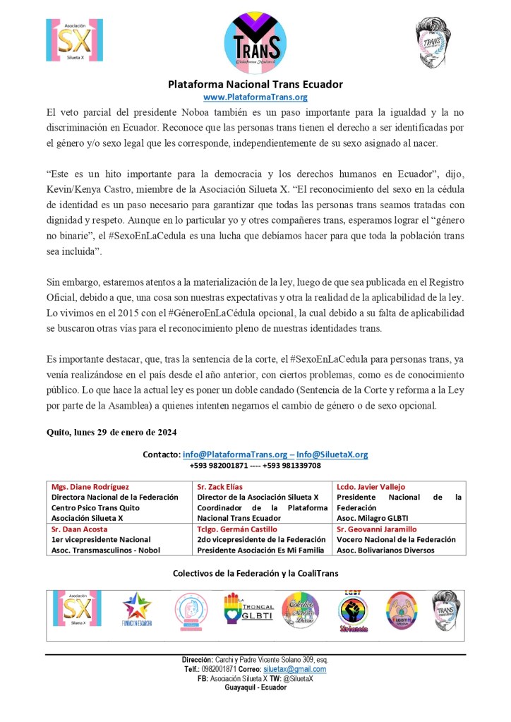 Las personas trans en Ecuador aplaudimos hoy, un importante avance en la lucha por nuestros derechos, tras la aprobación del veto parcial del presidente Daniel Noboa a la Ley Orgánica del Registro Civil, Identificación y Cedulación.