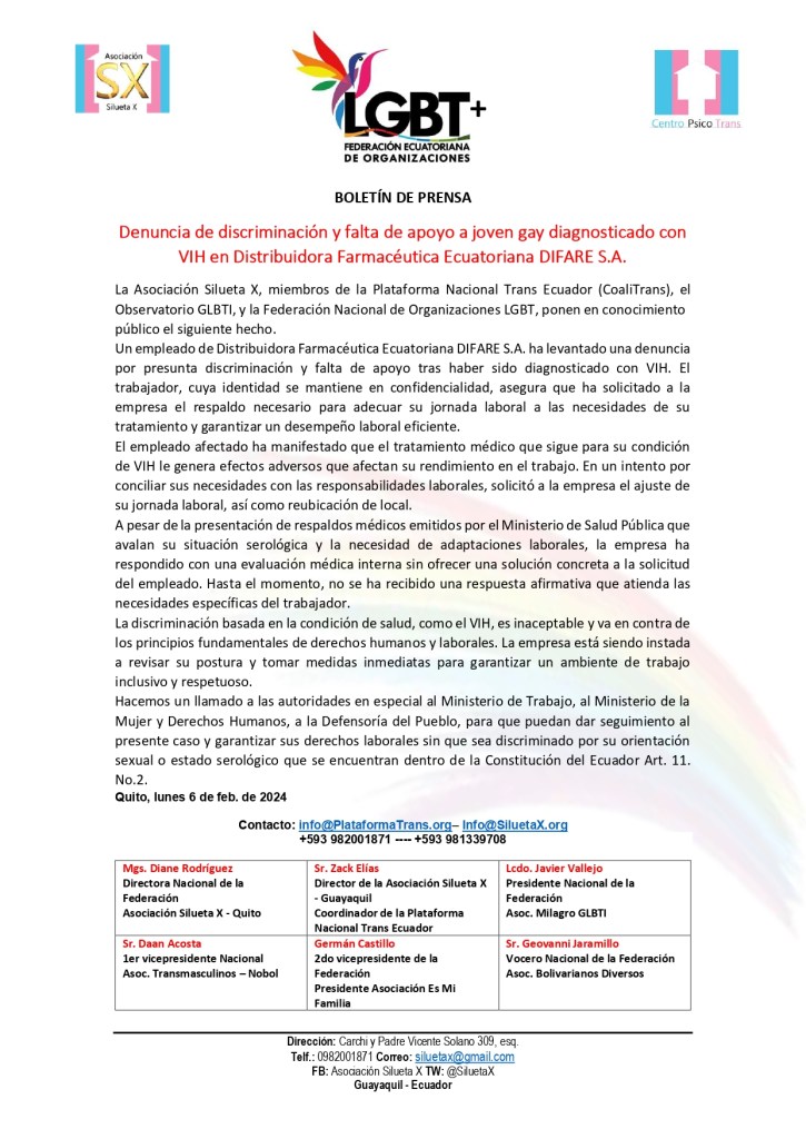 Hacemos un llamado a las autoridades en especial al Ministerio de Trabajo, al Ministerio de la Mujer y Derechos Humanos, a la Defensoría del Pueblo, para que puedan dar seguimiento al presente caso y garantizar sus derechos laborales sin que sea discriminado por su orientación sexual o estado serológico que se encuentran dentro de la Constitución del Ecuador Art. 11. No.2.