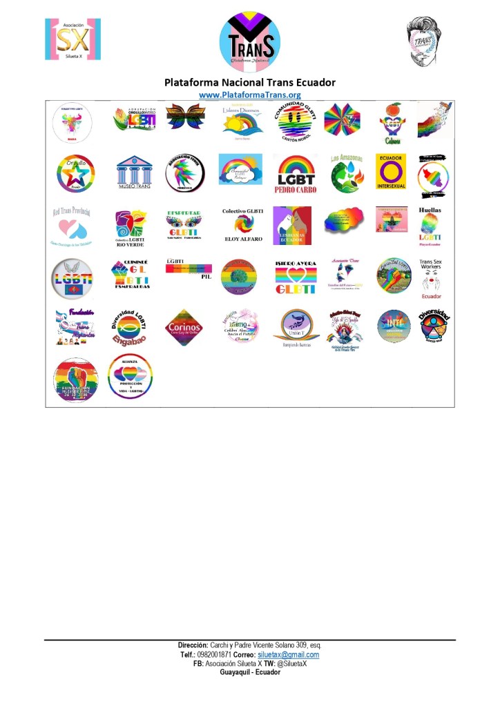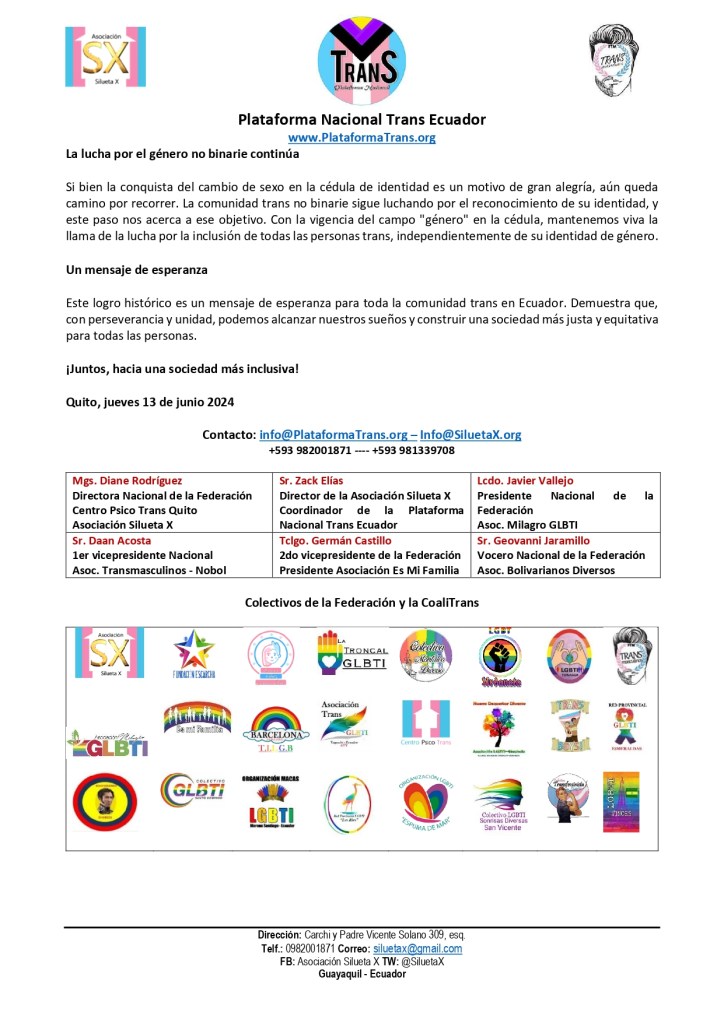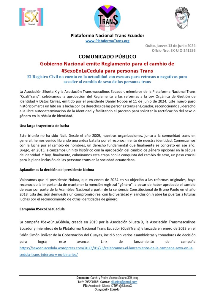 La Asociación Silueta X y la Asociación Transmasculinos Ecuador, miembros de la Plataforma Nacional Trans «CoaliTrans», celebramos la aprobación del Reglamento a las reformas a la Ley Orgánica de Gestión de Identidad y Datos Civiles, emitido por el presidente Daniel Noboa el 11 de junio de 2024. Este nuevo paso histórico marca un hito en la lucha por los derechos de las personas trans en Ecuador, reconociendo su derecho a la libre autodeterminación de la identidad y facilitando el proceso para solicitar la rectificación del sexo o género en la cédula de identidad.