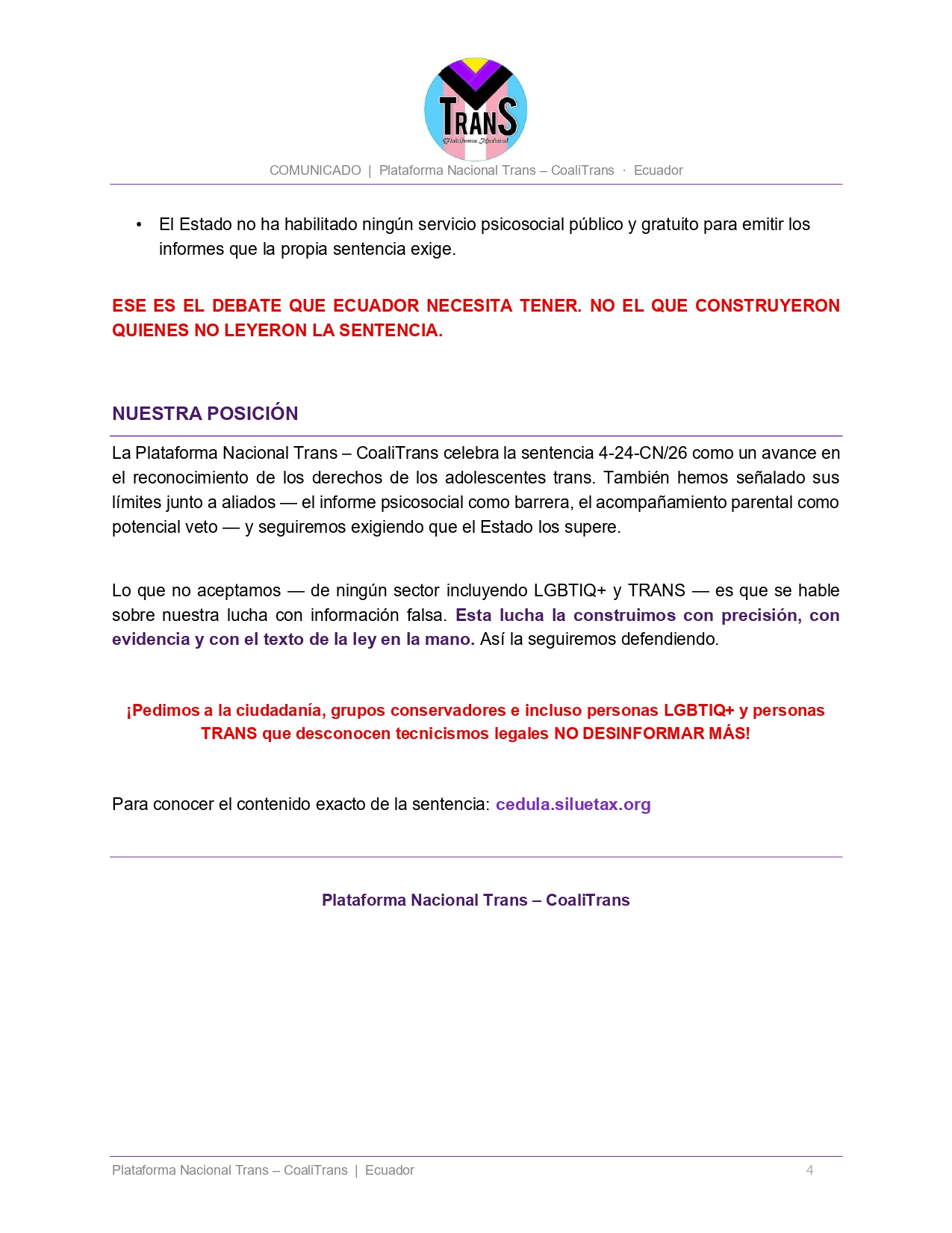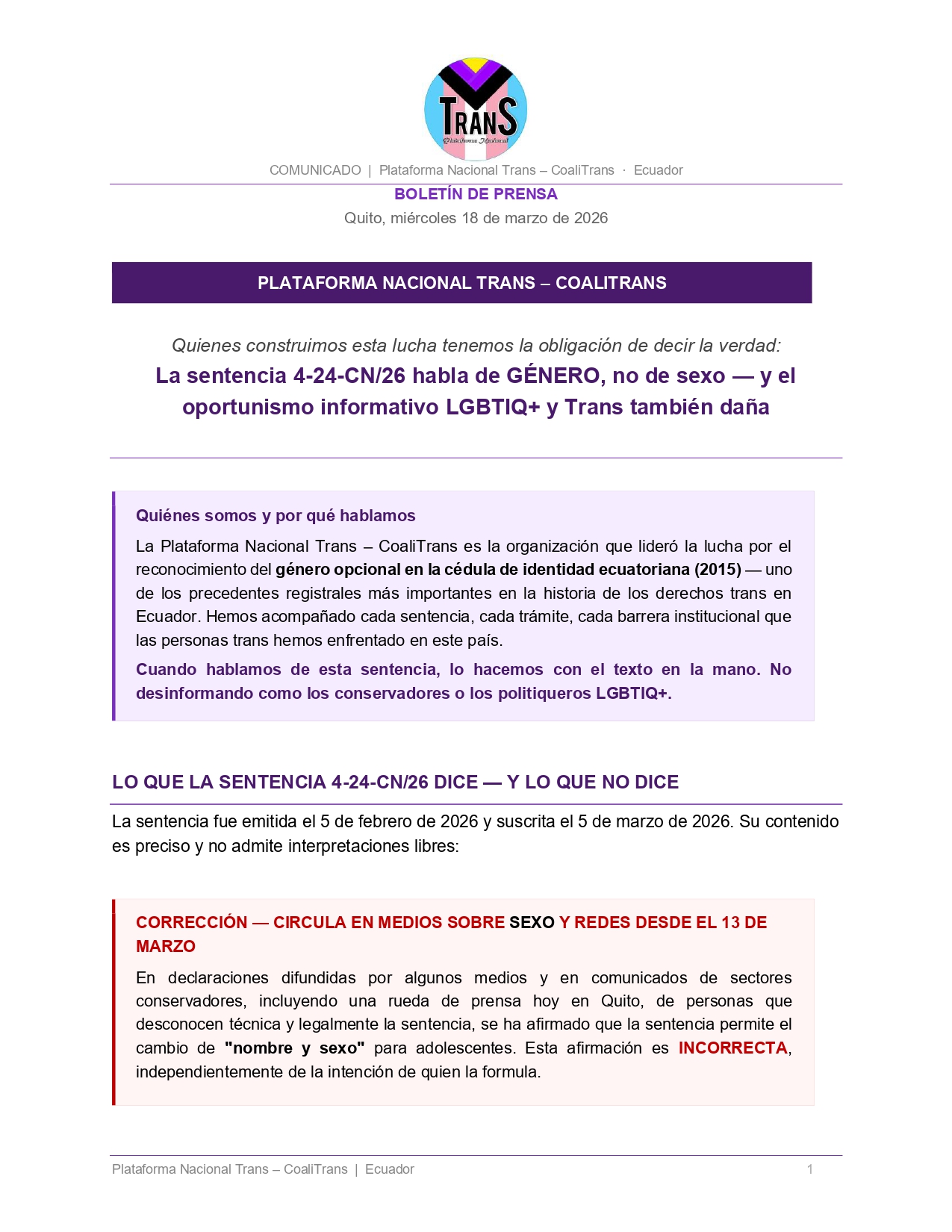 | Quiénes somos y por qué hablamos La Plataforma Nacional Trans – CoaliTrans es la organización que lideró la lucha por el reconocimiento del género opcional en la cédula de identidad ecuatoriana (2015) — uno de los precedentes registrales más importantes en la historia de los derechos trans en Ecuador. Hemos acompañado cada sentencia, cada trámite, cada barrera institucional que las personas trans hemos enfrentado en este país. Cuando hablamos de esta sentencia, lo hacemos con el texto en la mano. No desinformando como los conservadores o los politiqueros LGBTIQ+. |
