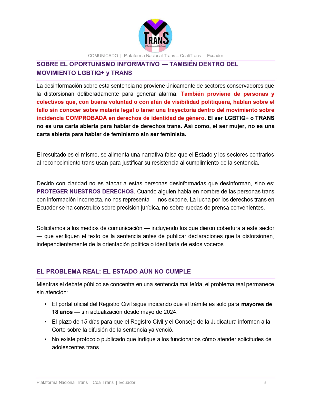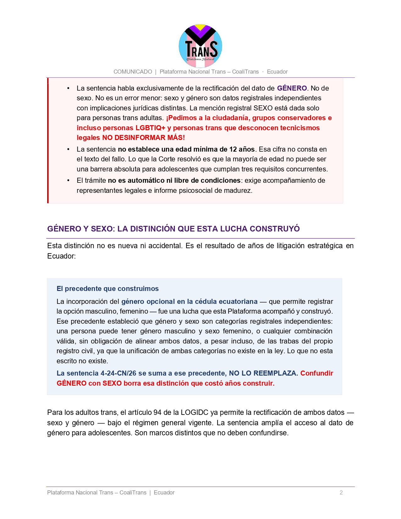 | CORRECCIÓN — CIRCULA EN MEDIOS SOBRE SEXO Y REDES DESDE EL 13 DE MARZO En declaraciones difundidas por algunos medios y en comunicados de sectores conservadores, incluyendo una rueda de prensa hoy en Quito, de personas que desconocen técnica y legalmente la sentencia, se ha afirmado que la sentencia permite el cambio de «nombre y sexo» para adolescentes. Esta afirmación es INCORRECTA, independientemente de la intención de quien la formula. La sentencia habla exclusivamente de la rectificación del dato de GÉNERO. No de sexo. No es un error menor: sexo y género son datos registrales independientes con implicaciones jurídicas distintas. La mención registral SEXO está dada solo para personas trans adultas. ¡Pedimos a la ciudadanía, grupos conservadores e incluso personas LGBTIQ+ y personas trans que desconocen tecnicismos legales NO DESINFORMAR MÁS!La sentencia no establece una edad mínima de 12 años. Esa cifra no consta en el texto del fallo. Lo que la Corte resolvió es que la mayoría de edad no puede ser una barrera absoluta para adolescentes que cumplan tres requisitos concurrentes.El trámite no es automático ni libre de condiciones: exige acompañamiento de representantes legales e informe psicosocial de madurez. |