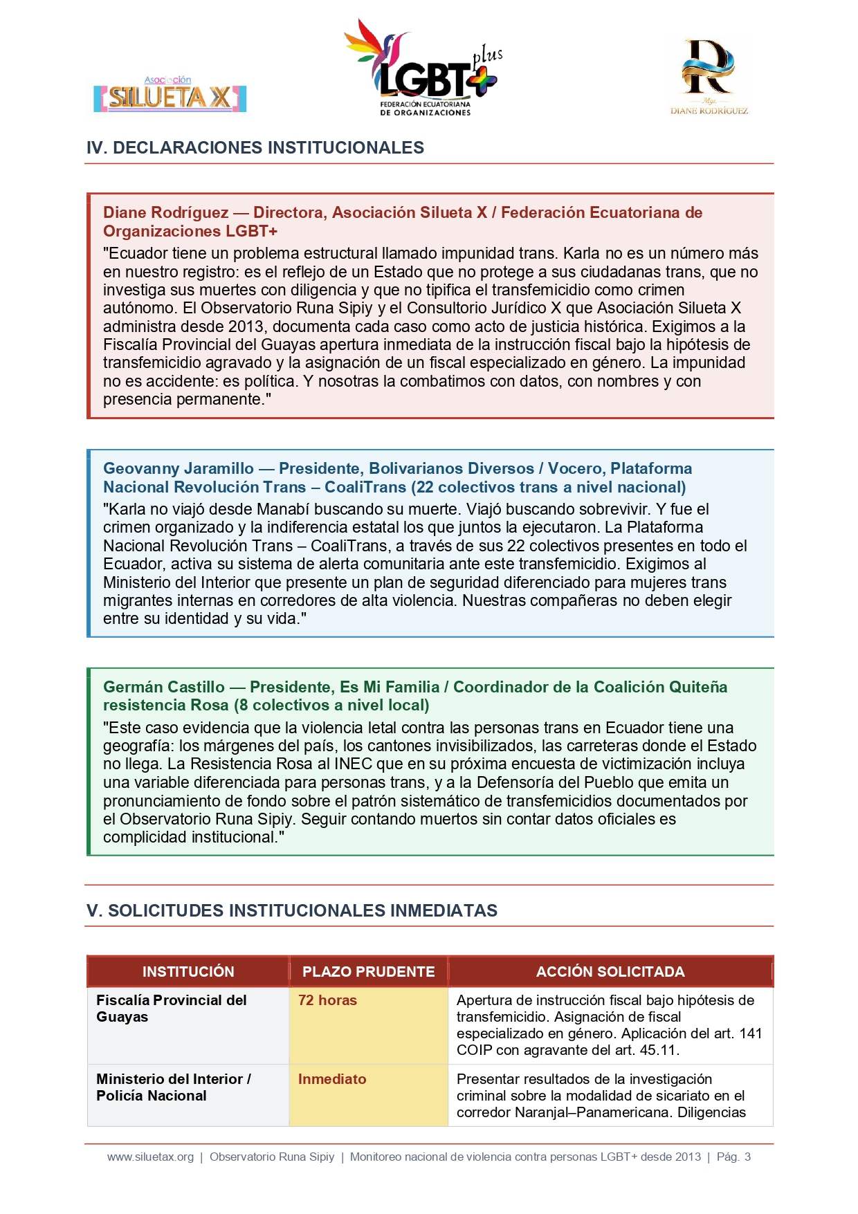 | Diane Rodríguez — Directora, Asociación Silueta X / Federación Ecuatoriana de Organizaciones LGBT+ «Ecuador tiene un problema estructural llamado impunidad trans. Karla no es un número más en nuestro registro: es el reflejo de un Estado que no protege a sus ciudadanas trans, que no investiga sus muertes con diligencia y que no tipifica el transfemicidio como crimen autónomo. El Observatorio Runa Sipiy y el Consultorio Jurídico X que Asociación Silueta X administra desde 2013, documenta cada caso como acto de justicia histórica. Exigimos a la Fiscalía Provincial del Guayas apertura inmediata de la instrucción fiscal bajo la hipótesis de transfemicidio agravado y la asignación de un fiscal especializado en género. La impunidad no es accidente: es política. Y nosotras la combatimos con datos, con nombres y con presencia permanente.» |