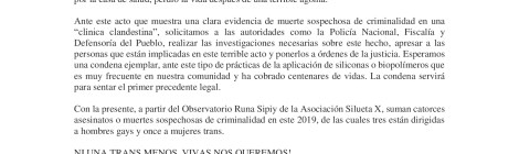 Boletín de Prensa Mujer Trans pierde la vida en Clínica clandestina en una aparente muerte sospechosa de criminalidad Las organizaciones trans nos unimos para comunicar un hecho que provoca estupor […]