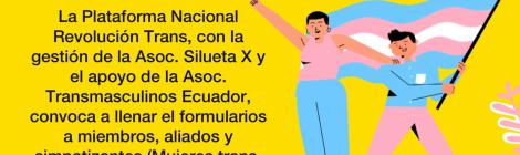 ENCUENTRO NACIONAL TRANS La Plataforma Nacional Revolución Trans, con la gestión de la Asoc. Silueta X y el apoyo de la Asoc. Transmasculinos Ecuador, convoca a llenar el formularios a […]
