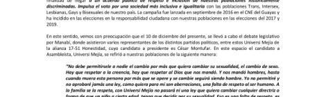 PRESENTAMOS UNA DENUNCIA ANTE EL TCE EN CONTRA DE LOS DISCURSOS DE ODIO DEL CANDIDATO A ASAMBLEISTA POR LA FORMULA 17-51 DE CÉSAR MONTUFARQuito, 16 de diciembre 2020Oficio SX-Campañas-API-20-01Dr. Arturo […]