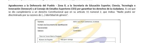 COMUNICADO SOBRE EL RECONOCIMIENTO DEL GÉNERO FEMENINO DE TRANSEXUAL EN TÍTULO UNIVERSITARIO La Federación ecuatoriana de organizaciones LGBTI, informa que el proceso administrativo de registro del título profesional de la […]