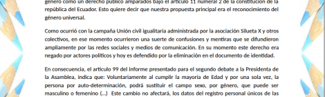 Réplica a tergiversaciones de reconocer sexo por género en cédula El pasado 30 de octubre Pamela Troya, del colectivo Matrimonio Civil Igualitario, mencionó que el proyecto de Ley Orgánica del […]