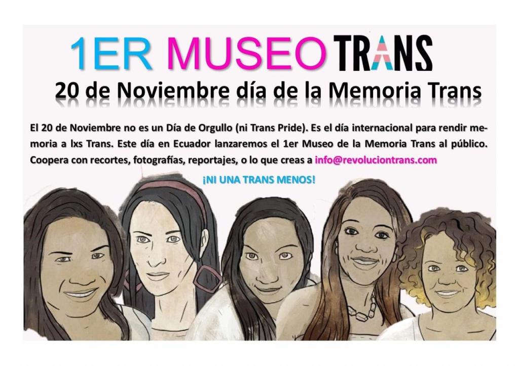 El 20 de Noviembre no es un Día de Orgullo Trans (ni Trans Pride). Es el día internacional para rendir memoria a lxs Trans. Este día en Ecuador lanzaremos el 1er Museo de la Memoria Trans al público. Coopera con recortes, fotografías, reportajes, o lo que creas a info@revoluciontrans.com